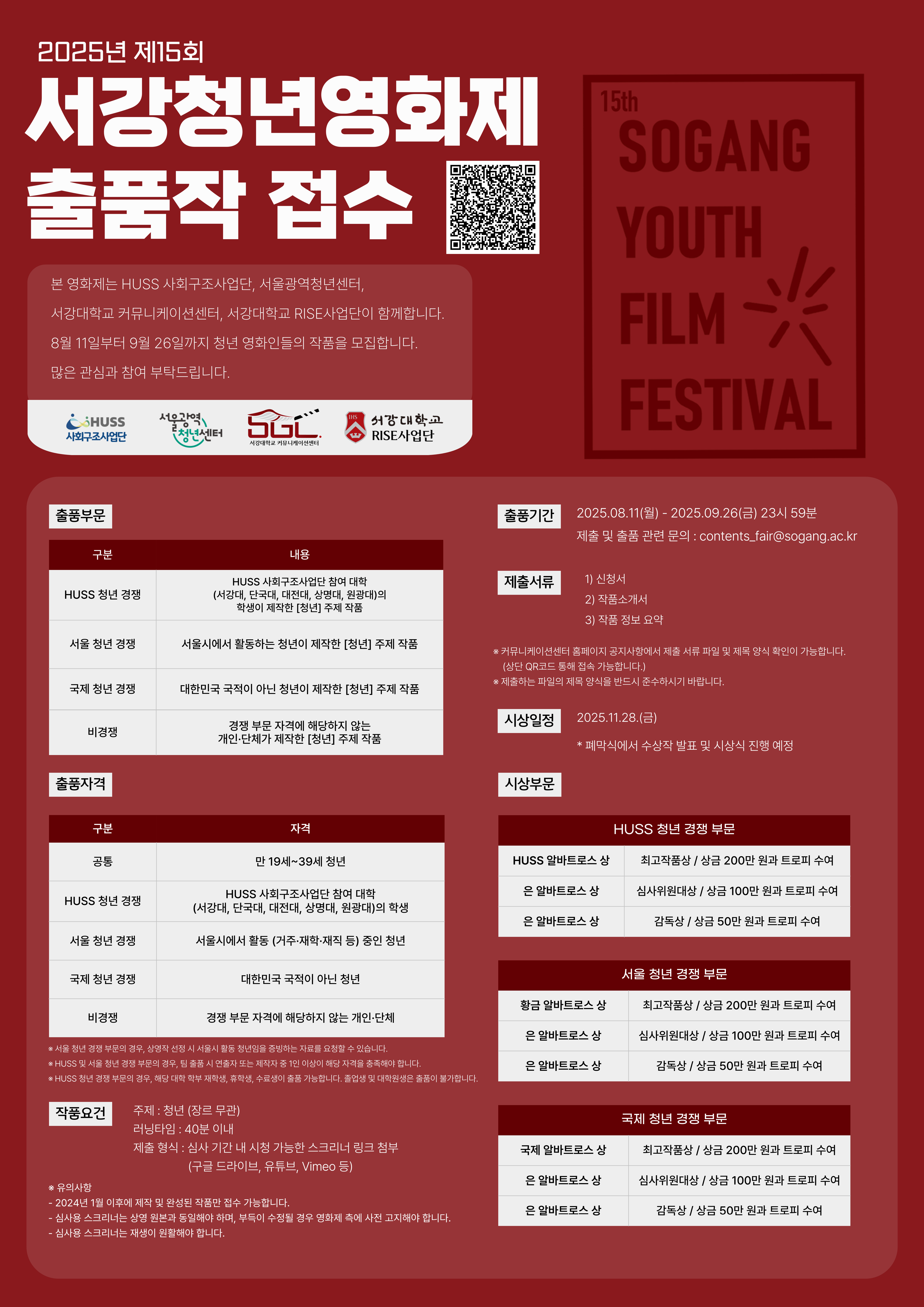 상명 [비교과] [HUSS 인문사회융합인재양성사업단] 제15회 서강청년영화제 ‘HUSS 청년 경쟁’ 부문 출품작 모집 안내 -